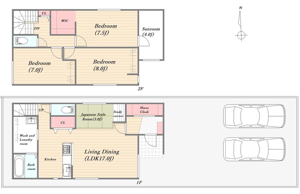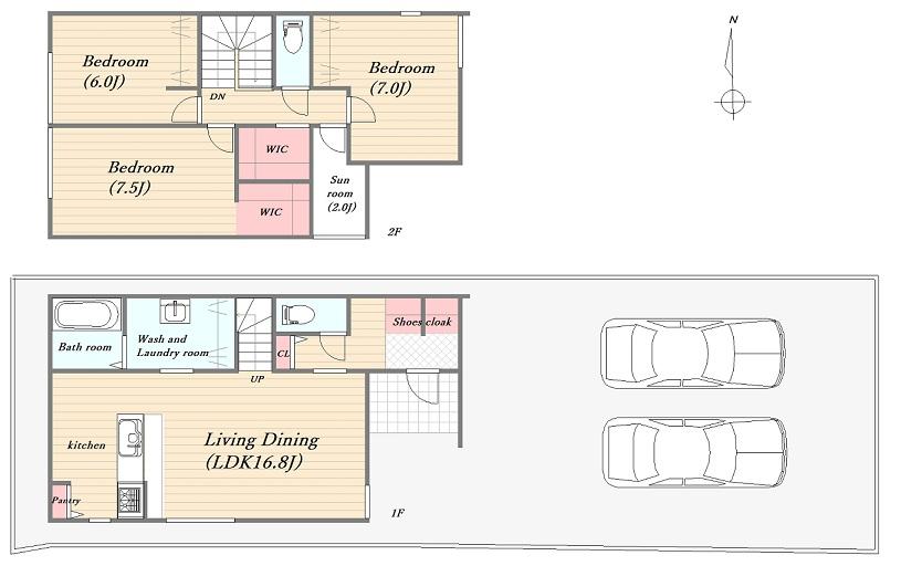 | 設備 | 駐車2台可 / スーパー 徒歩10分以内 / システムキッチン / 陽当り良好 / 全居室収納 / LDK15畳以上 / 和室 / シャワー付洗面化粧台 / 対面式キッチン / トイレ2ヶ所 / 浴室1坪以上 / パントリー(食器・食品の収納庫) / ウォークインクローゼット / リビング階段 / シューズインクローク | ||||