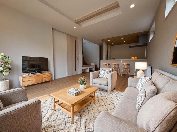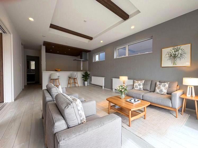 【2号棟】LDK(20.0帖)南側にリビングを配置+各所に窓を配置することで太陽の光が多く入、開放感を感じれるよう工夫しました。※家具・家電・雑貨類はCGとなります。販売価格には含まれておりません。