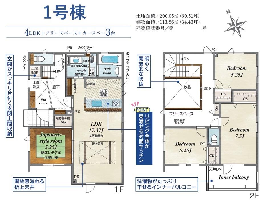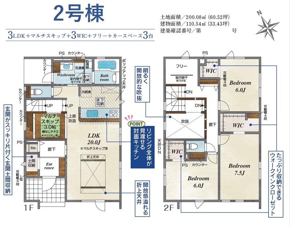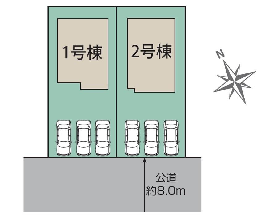 | 建物面積 | 107.23㎡~107.85㎡(32.43坪~32.62坪) | 土地面積 | 200.05㎡~200.08㎡(60.51坪~60.52坪)(実測) | ||