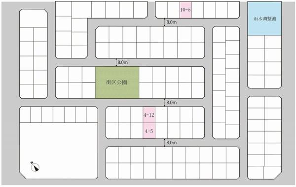 地目 | - | 道路付け | 道路幅:8m、アスファルト舗装、(4-5号地)、(4-12号地)、(10-5号地) 私道負担なし | ||