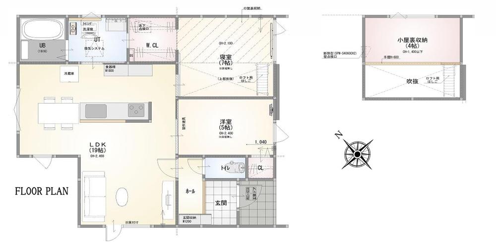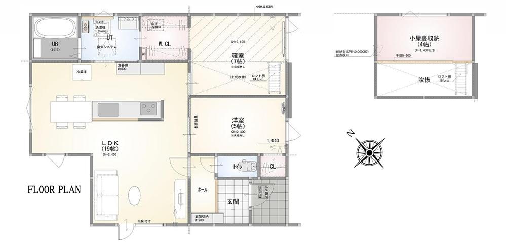 大曲建売モデルハウスNo.6【平屋・GX志向型住宅】 間取り図 ソーラーシステム搭載19帖のLDKに、回遊できるウォークスルークローゼット、4帖の小屋裏収納。収納が充実しているのですっきり暮らせます♪