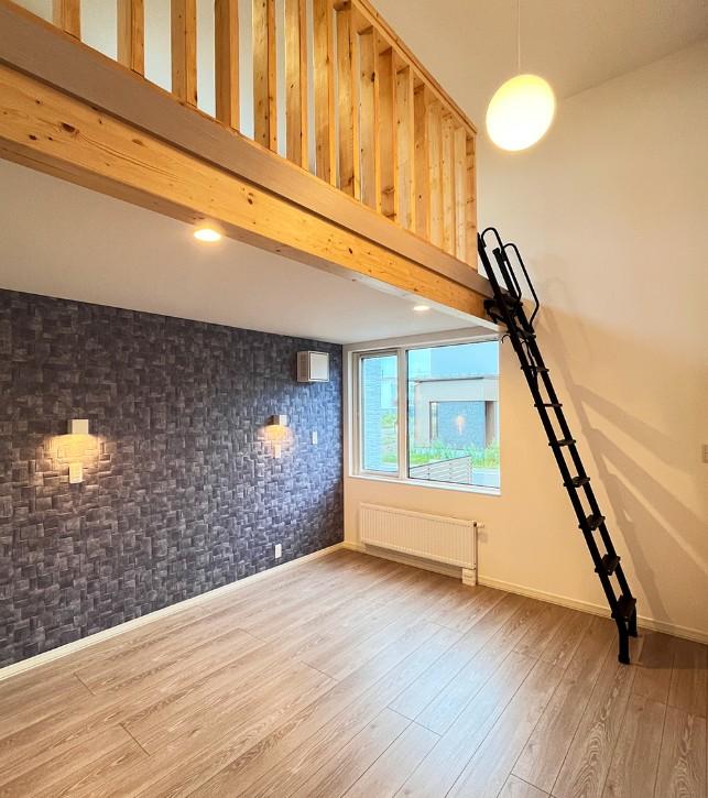 大曲建売モデルハウスNo.6吹き抜けと小屋裏収納がある7帖の寝室は、明るく開放的な空間に。小屋裏収納は4帖あり大容量なので、普段は使わない季節用品や日用品のストックなどもたっぷり収納できます♪
