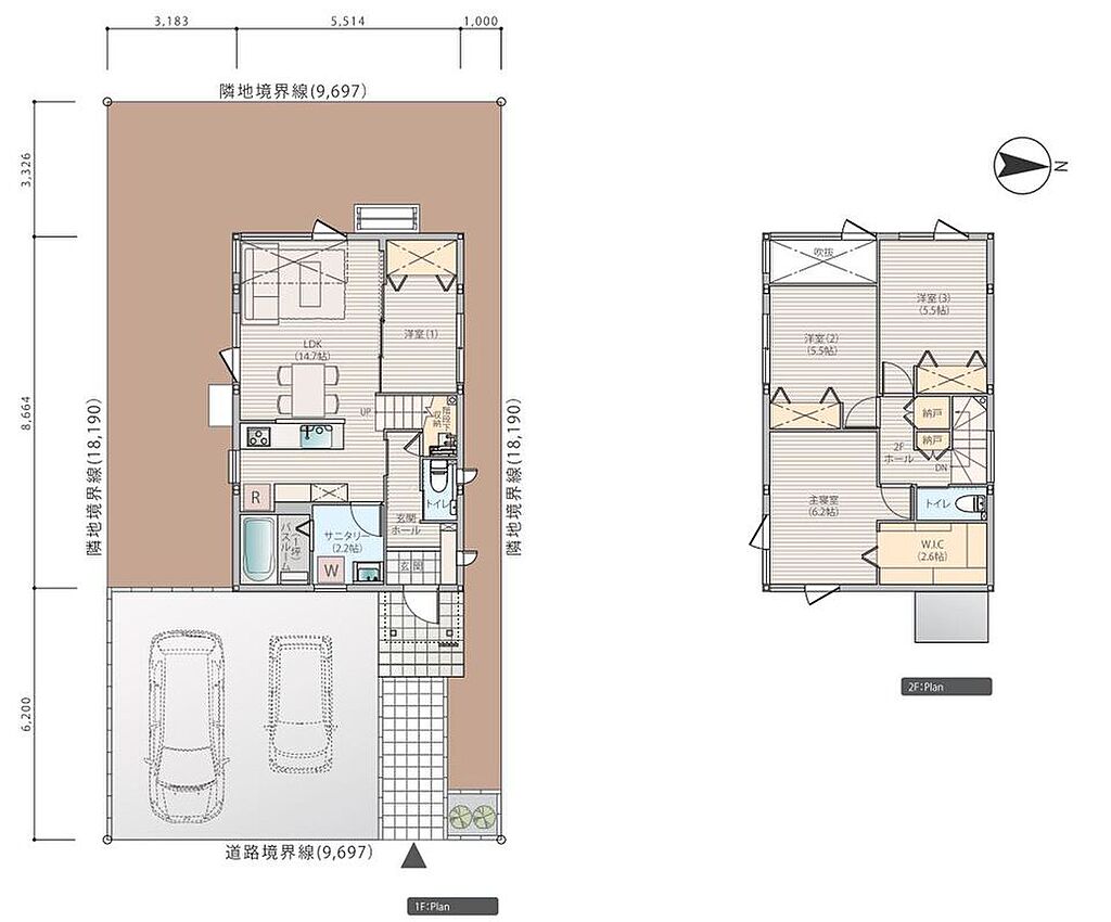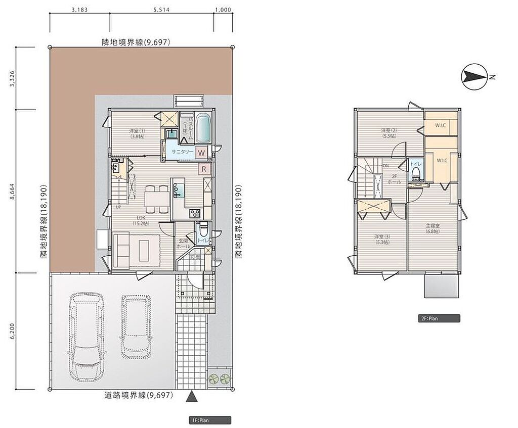 建物面積 | 92.28m2(2号棟)・94.93m2(3号棟) | 土地面積 | 176.38m2(2号棟)・176.39m2(3号棟) | ||
