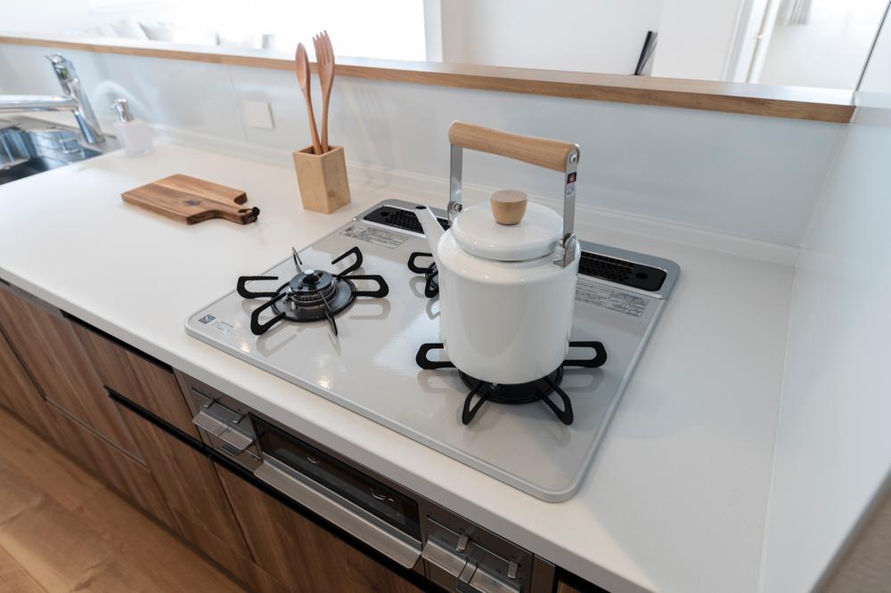 都市ガスを利用した3口のガスコンロは、高火力でお料理好きの方にもきっとご満足頂けます。モダンなデザインのシルバートップとフェイス、水貼不要で両面焼きのグリルはお掃除も楽々です。(2023年4月撮影)