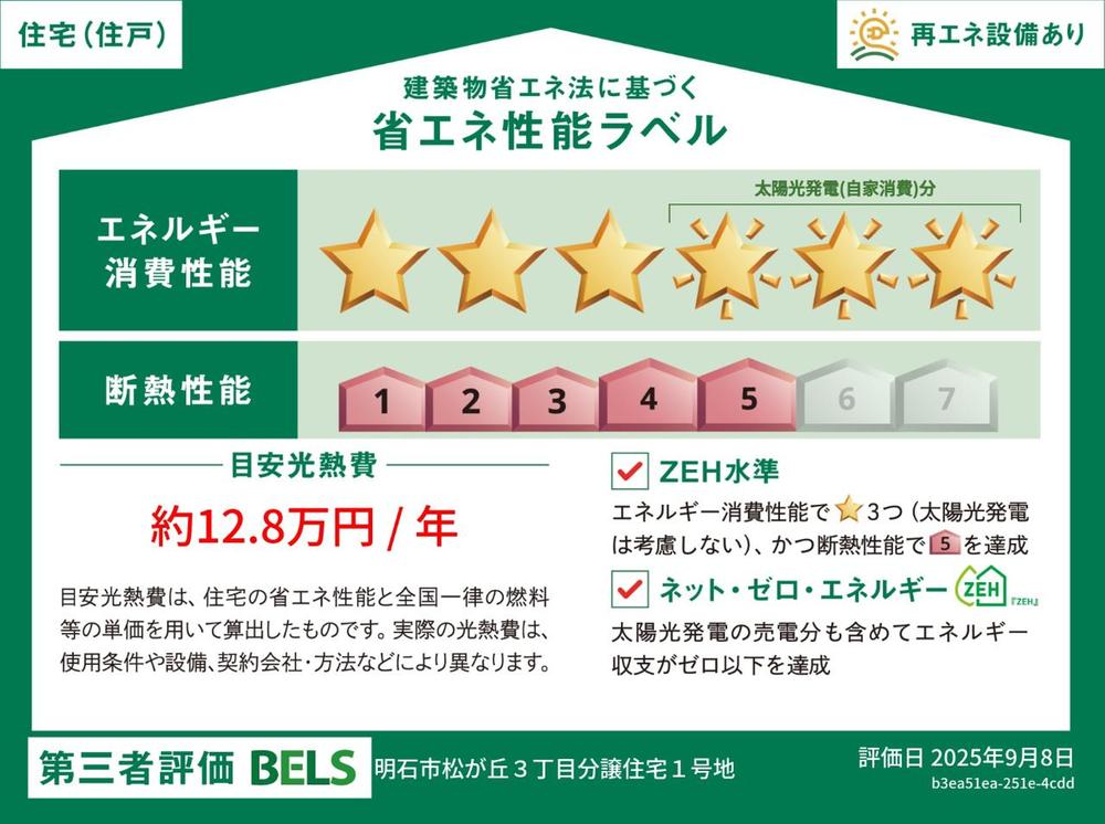 | 設備 | BELS/省エネ基準適合認定書あり / 太陽光発電システム / 駐車2台可 / スーパー 徒歩10分以内 / LDK15畳以上 / トイレ2ヶ所 / 浴室1坪以上 / 2階建 / 小学校 徒歩10分以内 / オール電化 | ||||