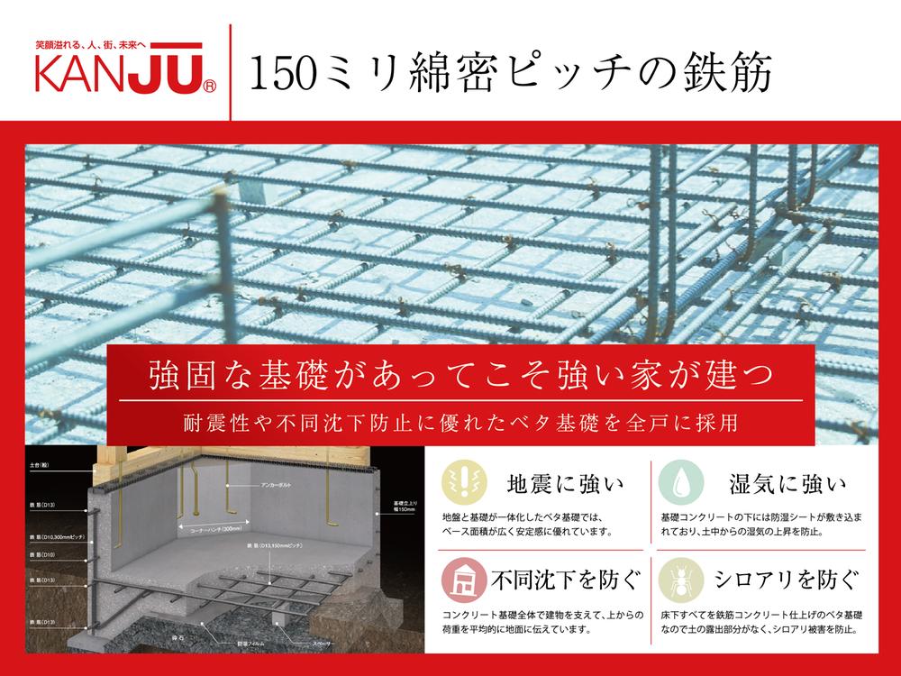 建物を支える基礎は、まさに強い家づくりの基本です。150mmピッチの緊密な配筋で鉄筋を組んでからコンクリートを施工。KANJUでは、引っ張る力に強い鉄筋と圧縮される力に強いコンクリート、それぞれの長所を活かした鉄筋コンクリート工法を使用します。耐震性や不同沈下防止に優れたベタ基礎を全戸に採用しています。