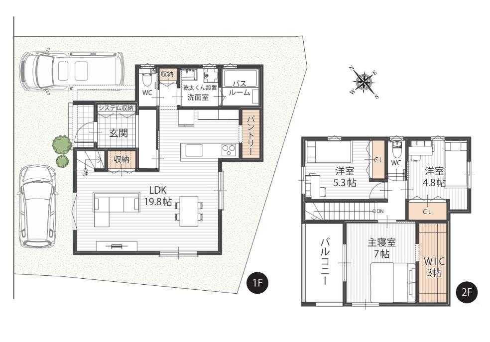| 設備 | 設計住宅性能評価書 / 建設住宅性能評価書(新築時) / 地盤調査済 / 駐車2台可 / LDK20畳以上 / スーパー 徒歩10分以内 / システムキッチン / 全居室収納 / 駅まで平坦 / 前道6m以上 / 対面式キッチン / 3面採光 / トイレ2ヶ所 / 2階建 / 南面バルコニー / 浴室に窓 / TVモニタ付インターホン / 全居室フローリング / パントリー(食器・食品の収納庫) / ウォークインクローゼット / リビング階段 / 都市ガス / シューズインクローク / 全室2面採光 / 小学校 徒歩10分以内 / 食器洗乾燥機 / 整備された歩道 | ||||