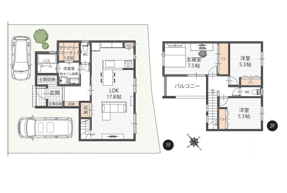 | 建物面積 | 95.75㎡・98.89㎡(28.96坪・29.91坪) | 土地面積 | 125.89㎡・129.11㎡(38.08坪・39.05坪) | ||