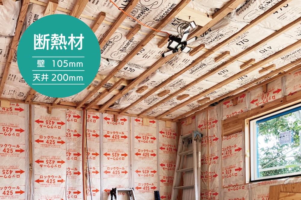 湿気に強いロックウール断熱材です。壁に使用している断熱材は105mm・屋根は200mmの断熱材を使用し、より省エネルギー設計になり高断熱はもちろん耐水性をあげることにより住まいの劣化を軽減し、万一の火災でも炎症を抑えます。