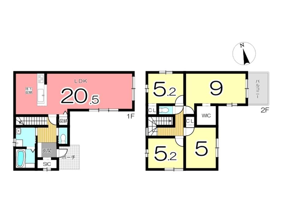 | 設備 | トイレ2ヶ所 / 2階建 / 床下収納 / ウォークインクローゼット / 都市ガス / 小学校 徒歩10分以内 | ||||
