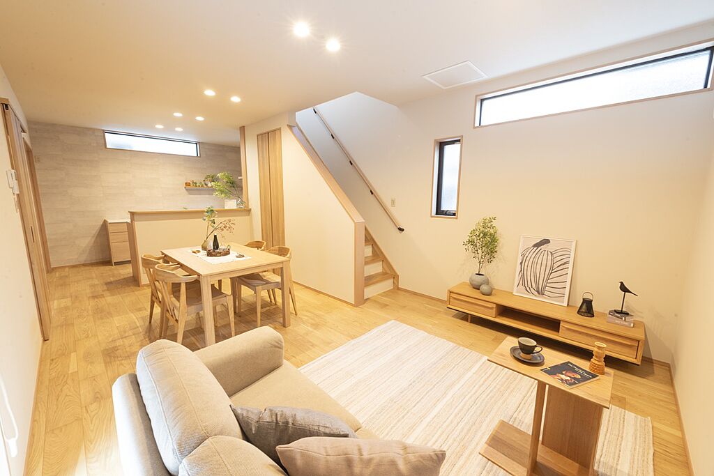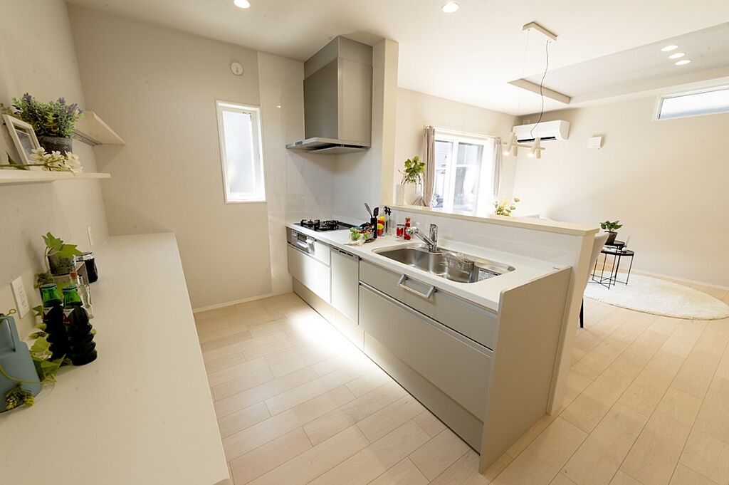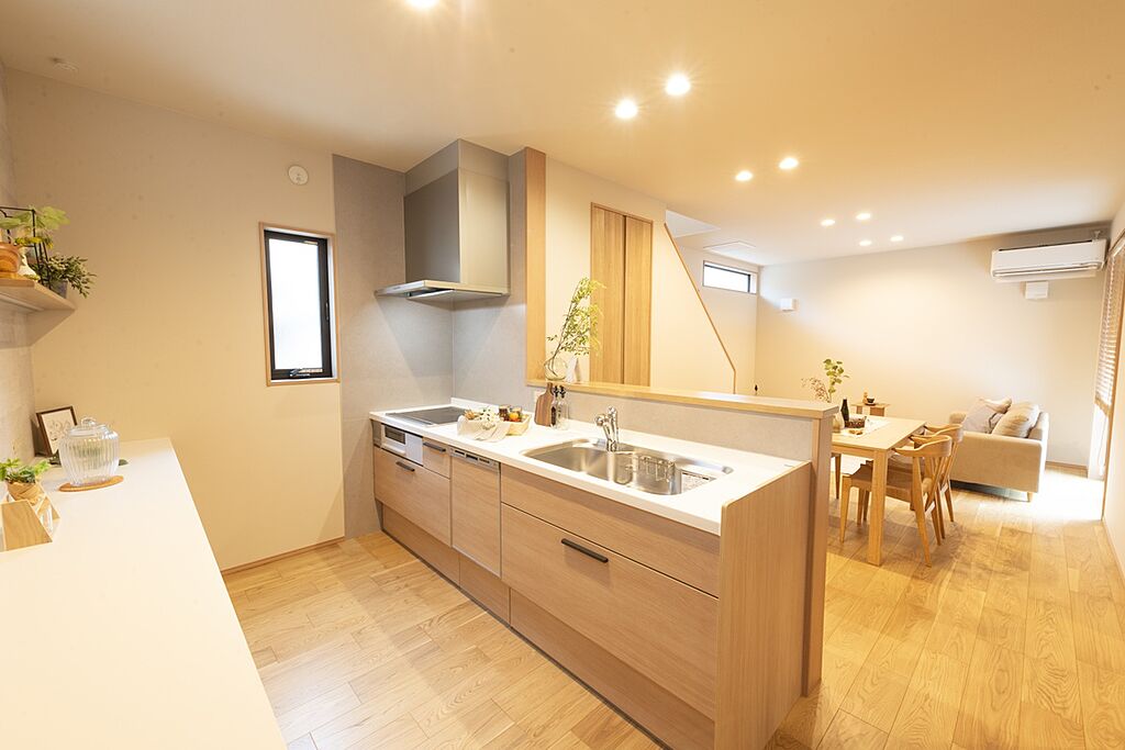 コミュニケーションを育む対面キッチン×リビング階段仕様。背面のカップボードは収納としてだけでなく調理スペースとしてもお使いいただけます。食器洗い乾燥機付きで、食後のお片付けがラクラクです。