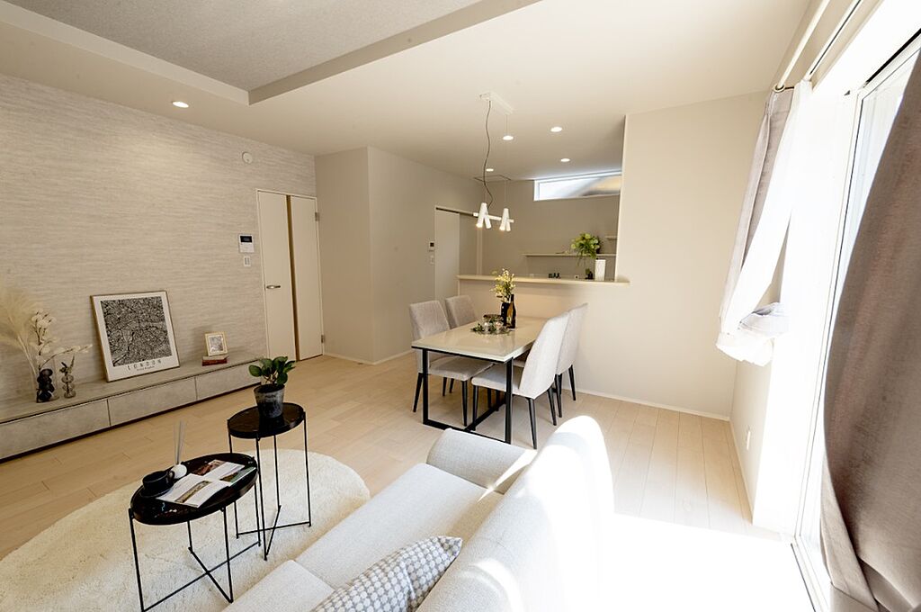 ホワイトを基調とした明るいLDKはリビング、ダイニング、キッチンに床暖房を敷設し、アクセントクロスの陰影などにより上質な印象に。リビング部分は折り上げ天井により高さが感じられ、開放感を添えています。