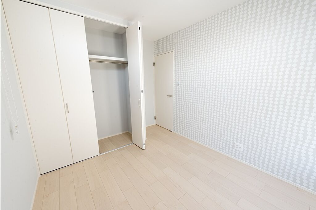 アクセントクロス×ホワイトの建具が爽やかなデザイン。2面採光でやわらかな自然光に包まれます。2階の3洋室は全て収納付き!サンルームで乾いた衣類を畳まずに保管することができ、収納家具が少なく済みます。