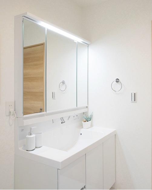 『施工例』見た目の美しさだけではなく、機能性も追求した独立洗面化粧台。広めで使いやすい、お手入れが楽なデザインのカウンターに収納豊富なキャビネットでいつもすっきり清潔に保てます。水栓は、お掃除のしやすいビルトインタイプです。