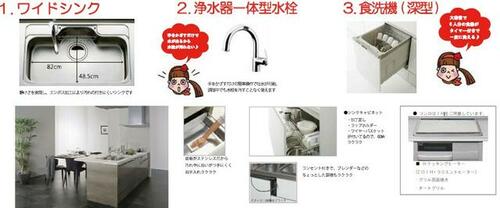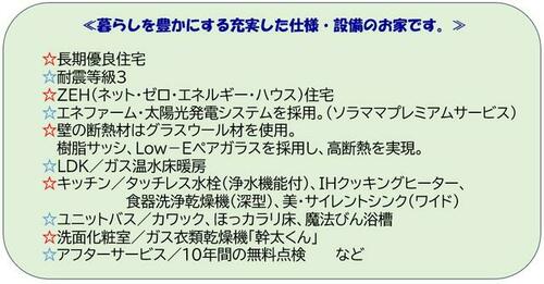| 設備 | 給湯・都市ガス・フローリング・浴室乾燥機・Wクロゼット・ウォシュレット・システムキッチン・カウンターキッチン・クロゼット・トイレ2ヶ所・床下収納・IHクッキングヒータ・浄水器・床暖房・食器洗浄乾燥機・複層ガラス・電気・上水道・下水道・太陽光発電システム・省エネ給湯器 | ||||