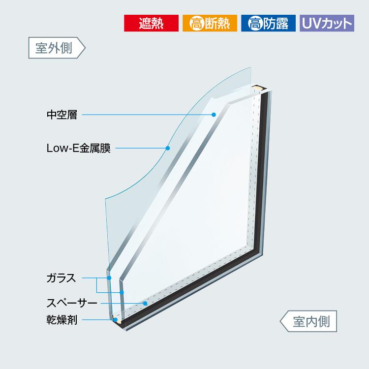 片側のガラスにコーティングされた特殊金属膜により高い断熱効果を発揮するLow-E複層ガラスと、耐久性の強いアルミ(屋外側)・断熱性の高い樹脂(屋内側)のハイブリッド構造のサーモスLにより、圧倒的な高断熱を実現。暖房時の熱の流出・冷房時の熱の流入を抑え、エアコン効率を高めて、冬は暖かく夏は涼しい優れた断熱性で室内をより過ごしやすく快適にします。住まいの省エネ化にも貢献。