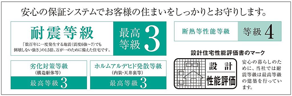 20年間の地盤品質保証(ジャパンホームシールド)を採用全区画地盤調査を行い、地盤の不同沈下に起因する建物の損害等を、地盤サポートシステム規程により対応。(限度額 5.000万円)