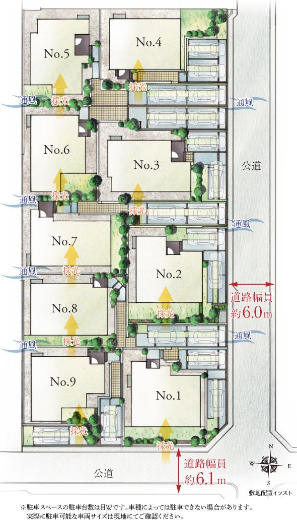 | 備考 | 設備:電気:大阪ガス電気、ガス:大阪ガス、宝塚市上水道局、公共下水道(分流式)、建築確認番号:第KS125-6120-51176号他、カースペース(全戸2台分)/※ゴミ置き場(2.07㎡)について1/9の共有持ち分有り。/※交通補足:〇交通・阪急甲陽線「苦楽園口」駅 徒歩12分(No.1~3、No.7~9)、徒歩13分(No.4~6)阪急神戸線「夙川」駅徒歩18分(No.9)、徒歩19分(No.1~8)、バス停「城山町」より徒歩2分(No.1、9)、徒歩3分(No.2~8)、東海道本線「さくら夙川」駅 バス10分 バス停から徒歩2分~3分 現地より「城山町」バス停まで徒歩2~3分、バス乗車時間2分、「常盤町」バス停から「さくら夙川」駅まで徒歩8分/※「交通」に表示する最寄駅など所要時間は本物件販売総戸数に対応した内容です。/〇建築物省エネ法に基づく省エネ性能①対象区画・No.1~No.9、②エネルギー消費性能:星5、③断熱性能・星5、④ZEH水準:該当あり、⑤ネット・ゼロ・エネルギー:該当あり、⑥目安光熱費・なし、⑦再エネ設備・該当あり/※本物件のNo.1号地の敷地のうち高圧線下の約78㎡、No.9の敷地のうち高圧線下の約61㎡には関西電力送配電(株)による地役権が設定されており、一定範囲について建築制限等があります。詳しくはスタッフまでお問い合わせください。/※完成時期補足:2025年12月予定(No.1,2,8,9)、2026年1月予定(No.4,5,6,7)、2026年2月予定(No.3) | ||||