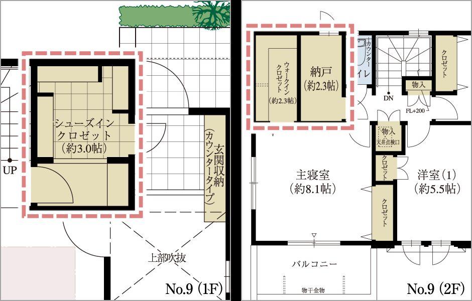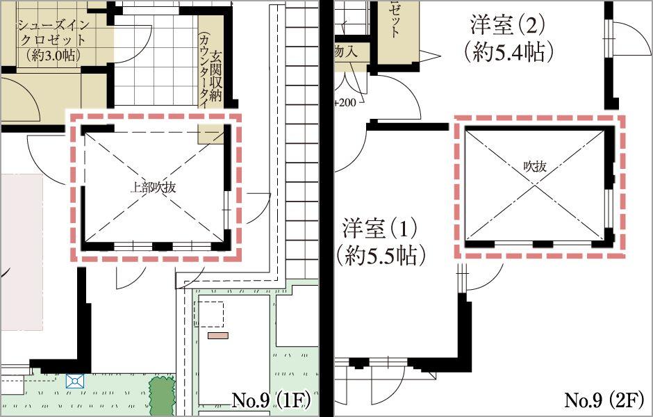 LDK(No.1)や玄関(No.3・7・8・9)の上部に吹抜を設置。開放的な空間と吹抜部の窓からの採光を確保。また、LDKに高天井・ハイサッシを採用。平面だけでなく立体的な広さを実現しました。