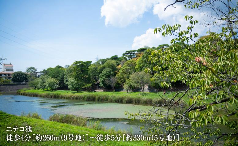 ニテコ池満々と水を湛えた市の貯水池「ニテコ池」。渡り鳥や鯉の姿が見られるほか、池周辺は桜並木として整備されており、散策にうってつけです。