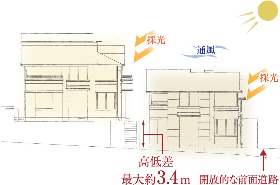 高低差のある敷地を活かし、全邸2台分の駐車スペースを実現しています。※駐車スペースの駐車台数は目安です。車種によっては駐車できない場合があります。実際に駐車可能な車両サイズは現地にてご確認ください。