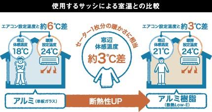 アルミ樹脂複合サッシを全窓に採用することで断熱性と遮熱性がアップし、断熱性能は従来の単板アルミサッシの約3.3倍に。窓辺の体感温度では従来と比べて約3℃の差があり、これはセーター1枚を着ている暖かさに相当します。