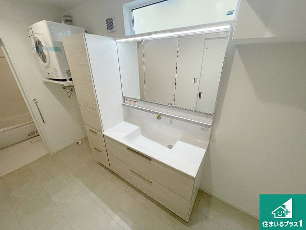 清潔感のある洗面台です。フラットな鏡は掃除がしやすく毎日清潔!鏡裏には収納があるのでスッキリとした洗面台が保てます。