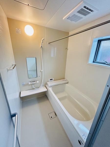 明るい照明と小窓が特徴のバスルームです。浴槽と洗い場が広々としておりお手入れがしやすい設計となっています。壁には手すりが設置されていて安心感があります。浴室乾燥機も付いているため快適に利用できます。