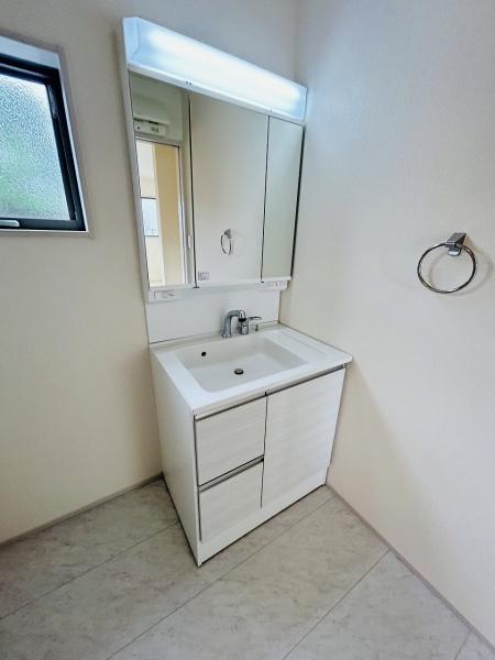 シンプルで洗練されたデザインの洗面台が設置されています。大きな鏡と明るい照明が使いやすさを感じさせます。収納スペースも備えておりすっきりと片付けられます。窓があり換気も行いやすい空間です。