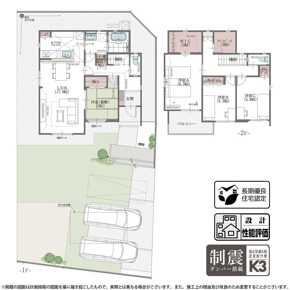 ※土地(建築条件なし)で「建物プラン例」が表記してある時、そのプラン例は特定の建築請負会社によるもので、当該建築請負会社以外で建てた場合、同様のものが同価格で建てられるとは限りません。また建築請負会社を特定するものではありません。