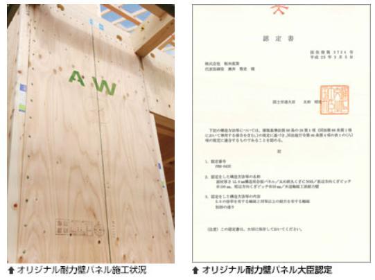 構造耐力上必要な軸組等について日本初の国土交通大臣認定を取得し、国が定める最高強度である「壁倍率5.0」の性能があると認められました。