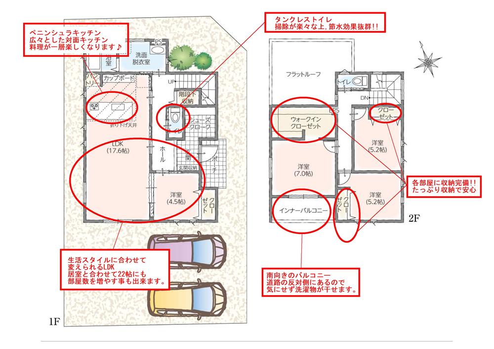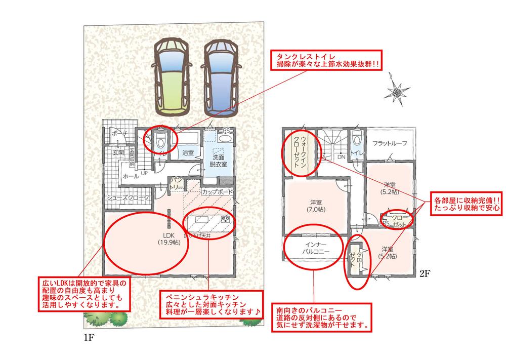 | 設備 | 長期優良住宅認定通知書 / フラット35Sに対応 / 地盤調査済 / 駐車2台可 / 省エネ給湯器 / スーパー 徒歩10分以内 / 市街地が近い / システムキッチン / 浴室乾燥機 / LDK15畳以上 / 角地 / 整形地 / シャワー付洗面化粧台 / 対面式キッチン / トイレ2ヶ所 / 浴室1坪以上 / 2階建 / 南面バルコニー / 複層ガラス / 温水洗浄便座 / 浴室に窓 / TVモニタ付インターホン / 節水型トイレ / 全居室フローリング / パントリー(食器・食品の収納庫) / ウォークインクローゼット / 天井高2.5m以上 / IHクッキングヒーター / 全居室複層ガラスか複層サッシ / シューズインクローク / 平坦地 / 食器洗乾燥機 / オール電化 / 浄水器 / スマートキー / 高機能トイレ | ||||