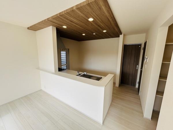 ウッド調の天井がアクセントになったキッチンです。カウンター付きで空間がすっきりとしています。照明が設けられているため手元も見やすく作業も快適です。キッチン横には収納スペースもあり整理しやすい配置です。
