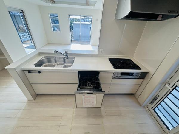 広々としたキッチンは明るく窓からの自然光がたっぷり入ります。収納も充実しており使い勝手の良いデザインです。シンクとコンロの配置も効率的で清潔感のある印象です。ビルトインの食洗機も備わっています。