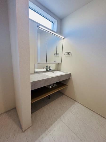 明るい窓から自然光が差し込む洗面台です。大きな鏡が設置されており使い勝手のよい空間が広がります。カウンター下にはオープン収納があり整理整頓にも便利です。壁付け照明で手元が見やすい仕様です。