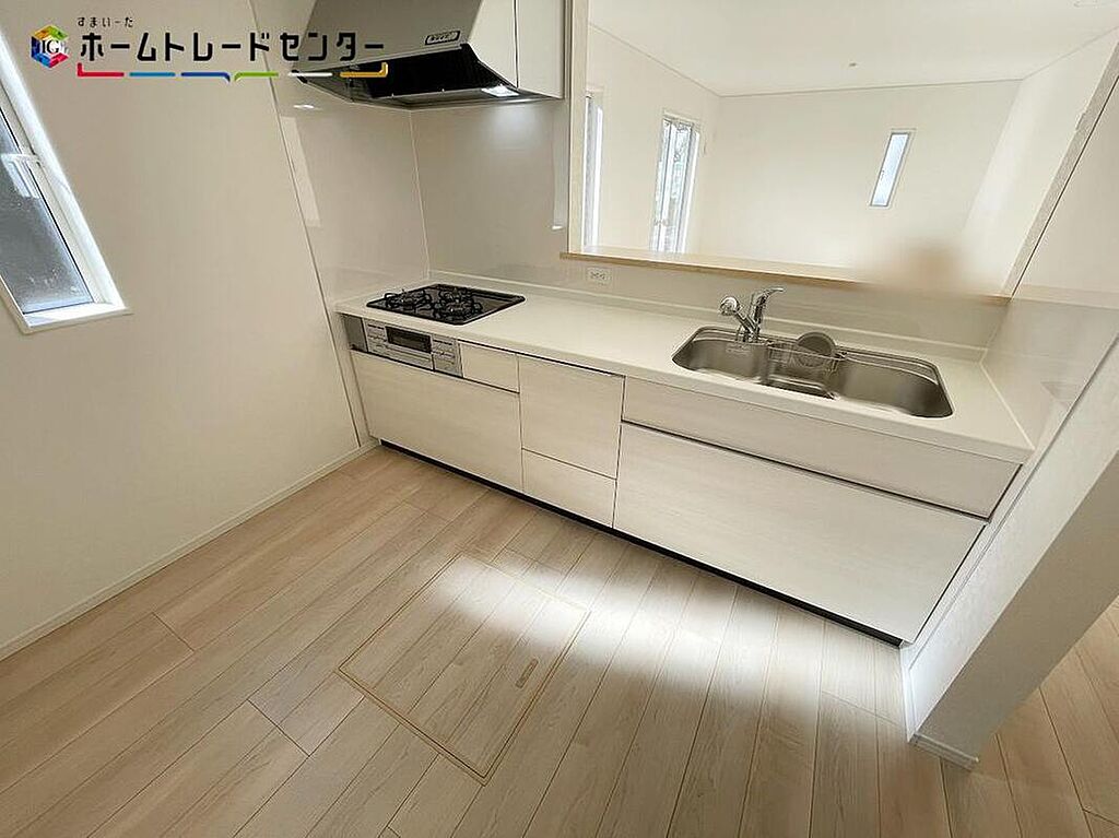 1号棟おしゃれなカウンターキッチン♪リビングで遊んでいるお子様を見守りながら、時にはお喋りをしながら料理や後片付けができる人気の高いスタイルです♪テレビの話題や一日の出来事、食卓も会話が弾みますね♪