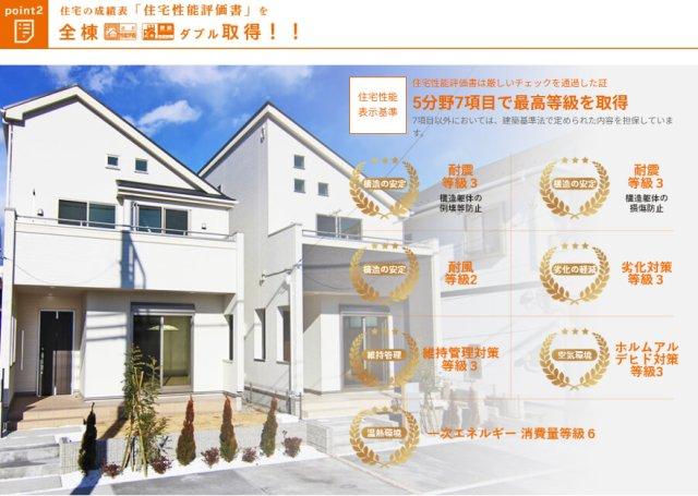 住宅性能評価書で5分野7項目の最高等級を取得した安心の住まいです。耐震等級3や劣化対策等級3・維持管理対策等級3・ホルムアルデヒド対策等級3を満たし、一次エネルギー消費等級6の省エネ性能も備えた高品質住宅です。