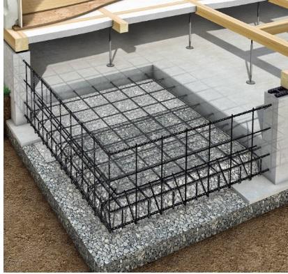 ベタ基礎は、底面一面が鉄筋コンクリートになっており、湿気が建物に伝わりにくく、住宅の木材腐食を抑えることができます。さらに地面をコンクリートで覆うので白蟻に対する予防策にも有効です。また、家の荷重を底面全体で受け止め、面で支えてくれるので、地震による揺れを分散し、建物の被害を軽減することができます。