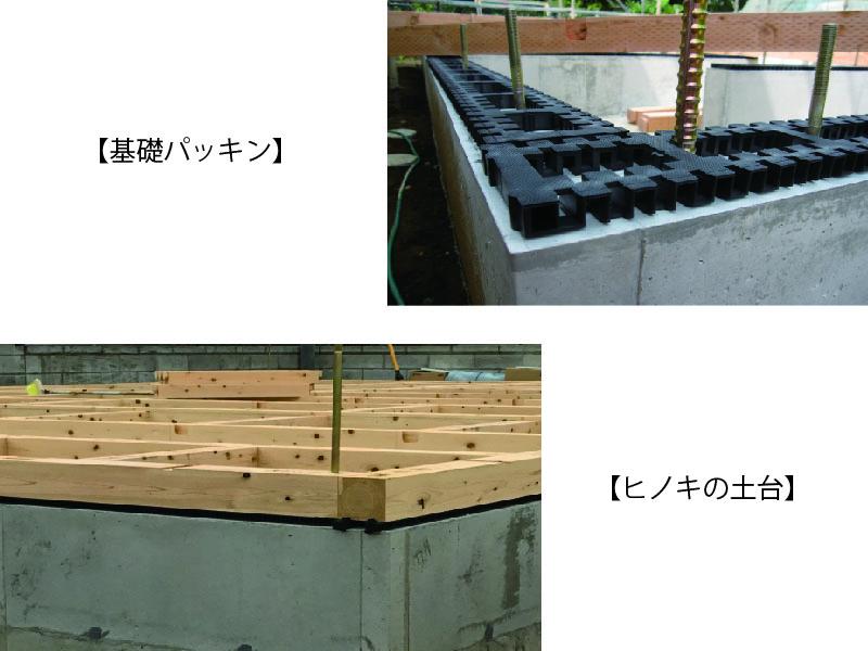 基礎と土台の間に基礎パッキンを挟むことで、常に通気が行なわれ、土台の木部を常にドライな状態に保つことができ、住宅の耐久性を上げることができます。土台には湿気に強く耐久性の高いヒノキを採用しています。