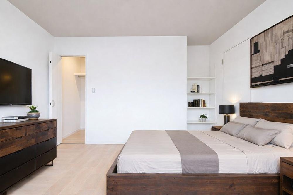 【施工例】寝室には大容量のウォークインクローゼット完備!豊富な収納スペースで、衣類や個人のアイテムを整理整頓することができます。スッキリした寝室は癒しの空間を提供します。※家具等の配置はイメージです。