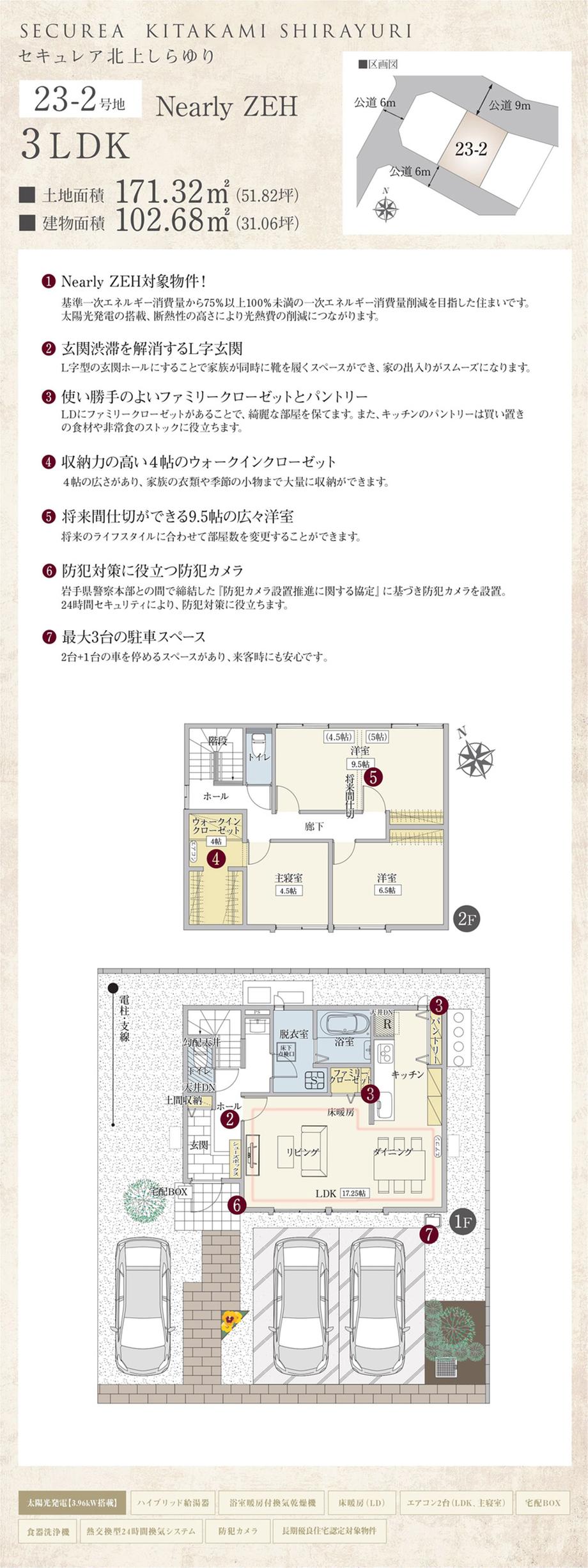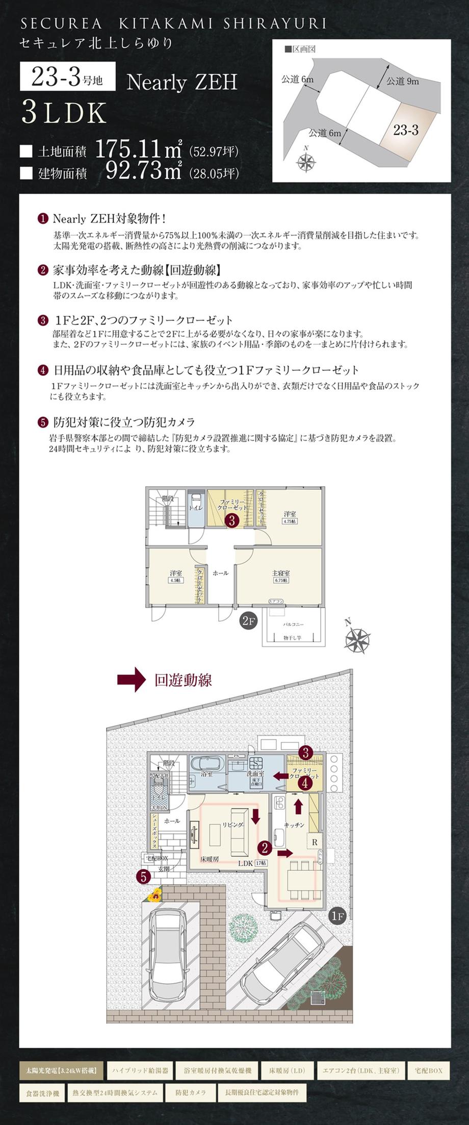 設備 | 開発分譲地内 / 大型タウン内 / 地盤調査済 / 長期優良住宅認定通知書 / 設計住宅性能評価書 / フラット35Sに対応 / 2階建 / 省エネ給湯器 / 駐車3台以上可 / 整形地 / 年度内引渡可 / 即引渡可 / 隣家との間隔が大きい / 全居室フローリング / 南面バルコニー / 複層ガラス / ウォークインクローゼット / 全居室収納 / TVモニタ付インターホン / 床暖房 / 建設住宅性能評価書(新築時) / 太陽光発電システム / 浴室乾燥機 / 浴室1坪以上 / トイレ2ヶ所 / 温水洗浄便座 / シャワー付洗面化粧台 / システムキッチン / 対面式キッチン / 浄水器 / 食器洗乾燥機 / IHクッキングヒーター / 土地50坪以上 / 南側道路面す / 駐車2台可 / 前道6m以上 / LDK15畳以上 / 平坦地 | ||||