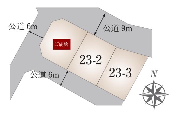 地目 | - | 道路付け | 道路幅:6m~9m、アスファルト舗装、(23-2号地)、(23-3号地) 全て私道負担なし | ||
