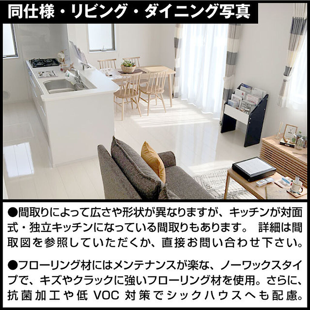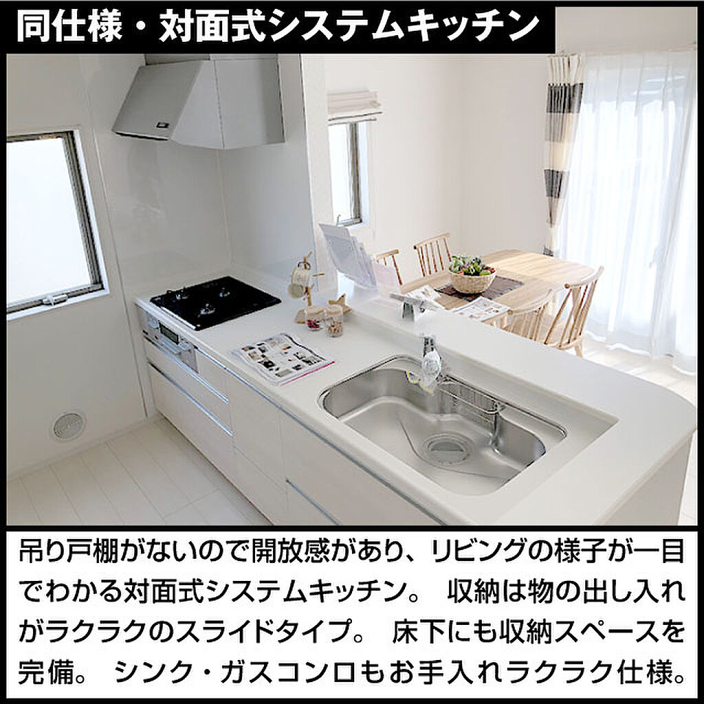 同仕様・対面式システムキッチン吊り戸棚がないので開放感があり、リビングの様子が一目でわかる対面式システムキッチン。収納は物の出し入れがラクラクのスライドタイプ。床下にも収納スペースを完備。