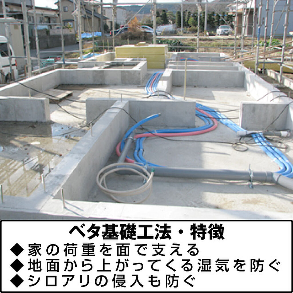 ベタ基礎工法を採用基礎には様々な工法がありますが、本物件は、耐震性・不等沈下防止・防アリ効果・防湿性に優れている、面で建物を支えるベタ基礎工法を採用しております。
