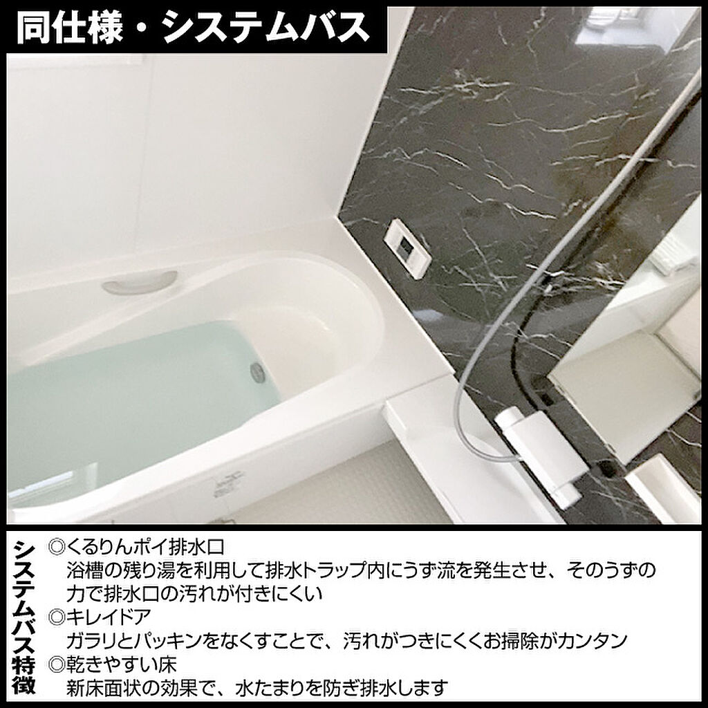 ・浴槽保温仕様・らくエコ浴槽・ポップアップ排水栓・ドライ床・排水口かんたんヘアーキャッチャー・電気式浴室暖房乾燥機・洗面器カウンター・ミキシング水栓・手元ストップ付シャワーヘッド