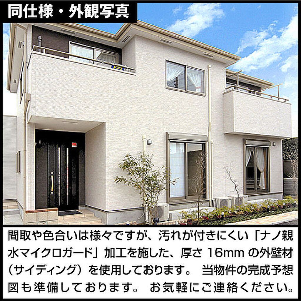 1号棟・外観写真。形や色合いは様々ですが、汚れが付きにくい「ナノ親水マイクロガード」加工を施した、厚さ16mmの外壁材(サイディング)を使用しております。 当物件の完成予想図も準備しております