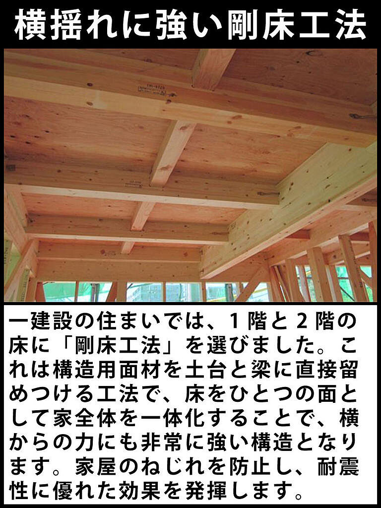 一建設の住まいでは、1階と2階の床に「剛床工法」を選びました。これは構造用面材を土台と梁に直接留めつける工法で、床をひとつの面として家全体を一体化することで、横からの力にも非常に強い構造となります。