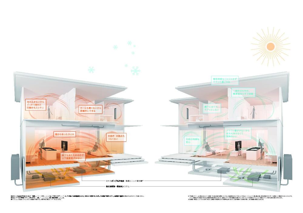 ①1階のフロア全体が足元からじんわり暖かい。 ②廊下や洗面所など部屋以外にも暖かさが届く。 ③家中の温度差を減らし、夏涼しく冬あったか。 ④お家の中の温度差が少ない心地よい暮らし。