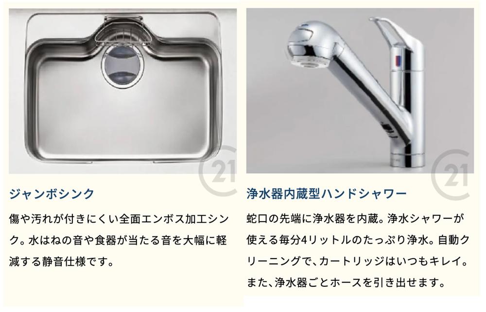 (同仕様モデル写真)キッチン!傷や汚れがつきにくい全面エンボス加工のジャンボシンクと浄水器内蔵のシャワー水栓!毎分4リットルのたっぷり浄水。自動クリーニングで、カートリッジはいつもキレイに保てます♪