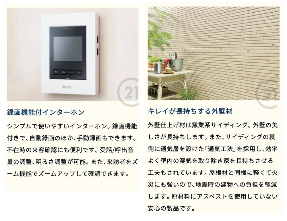 シンプルで使いやすいインターホン。録画機能付きで不在時の来客確認にも便利です♪外壁仕上材は、特殊なコーティングが施行されており、雨を利用し汚れを洗い落とすセルフクリーニング機能で綺麗を長持ちさせます♪